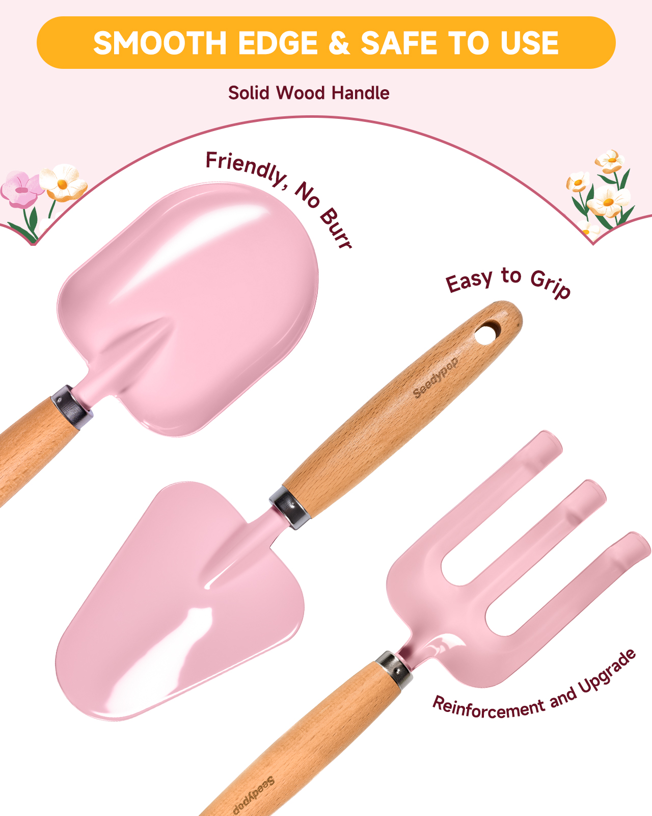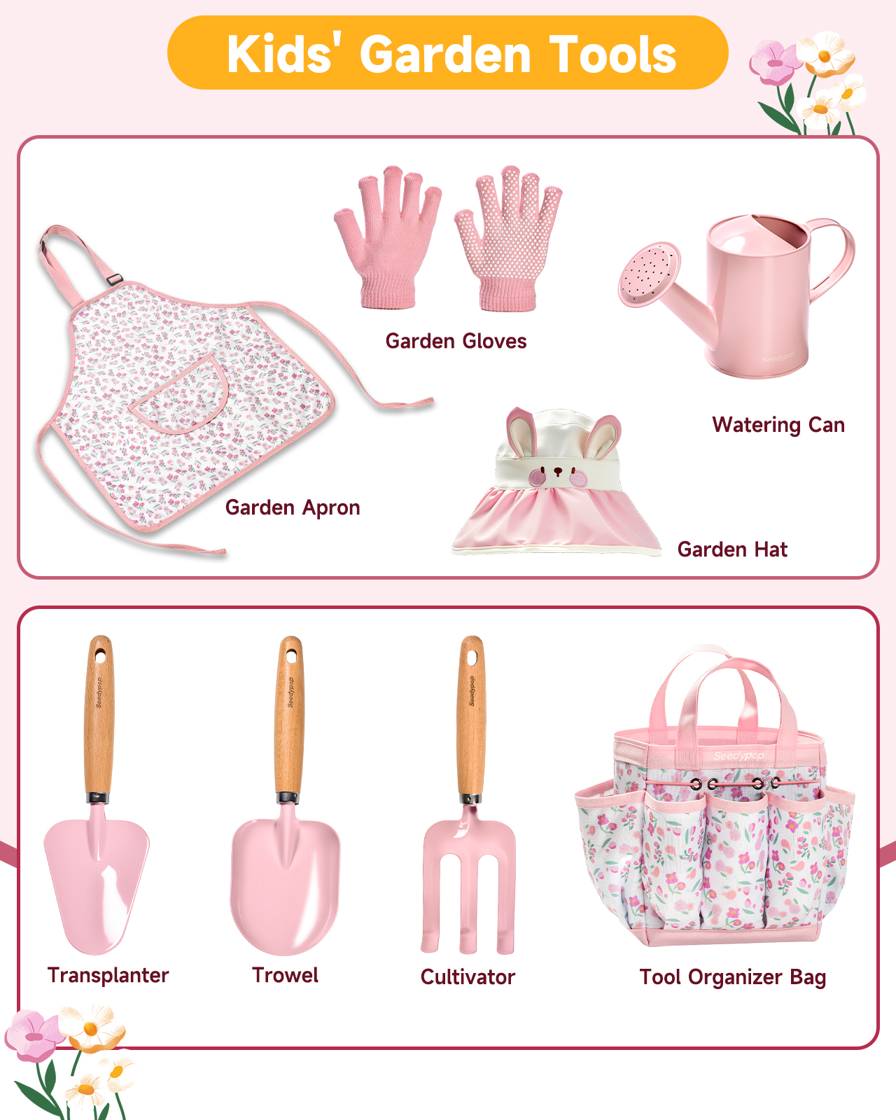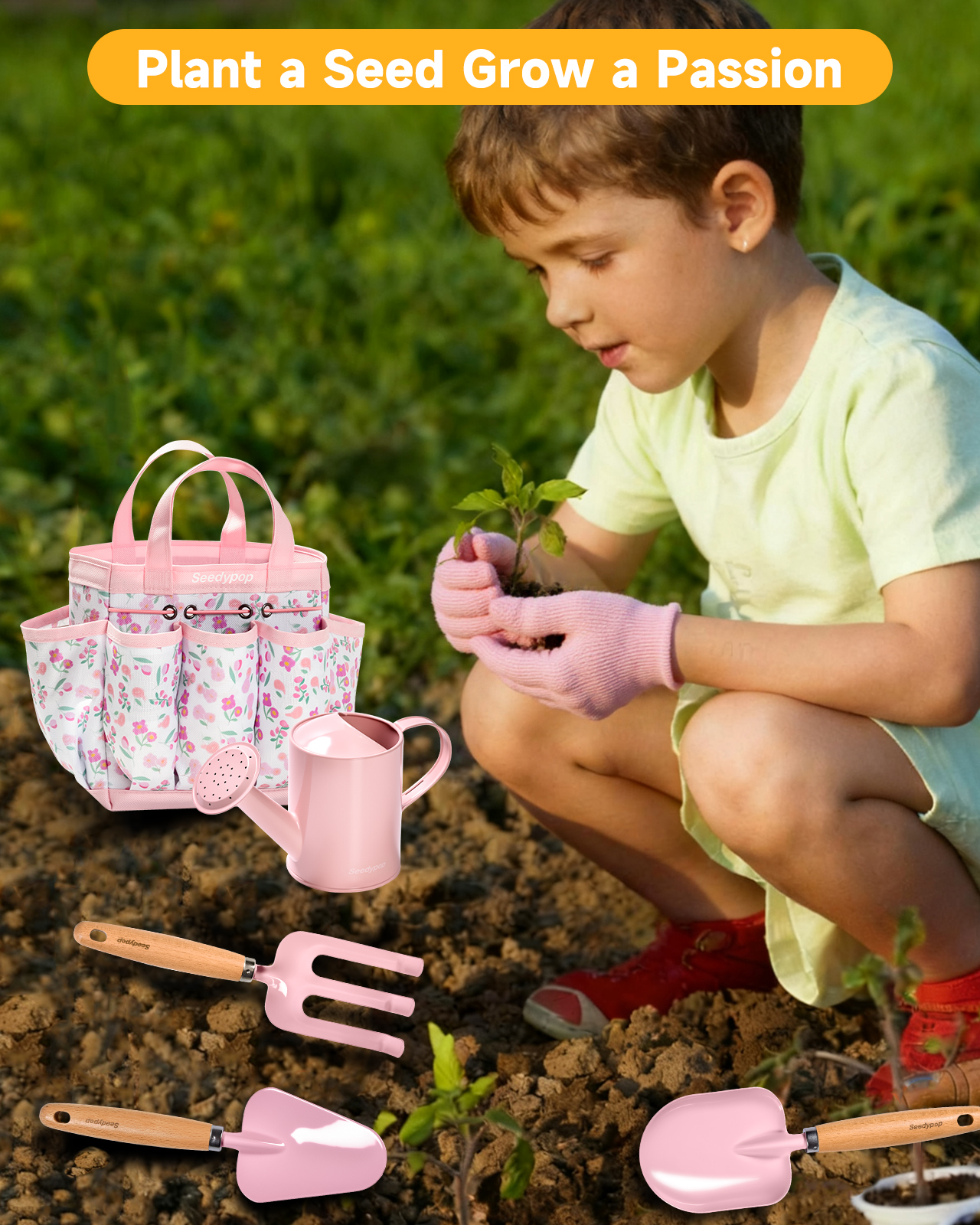 seedypop Kids Gardening Tool Set Toys – 8 Pieces Quality Garden Kit for Toddlers & Kids with Shovels, Rake, Watering Can, Hat, Apron, Gloves & Storage Bag(Pink)